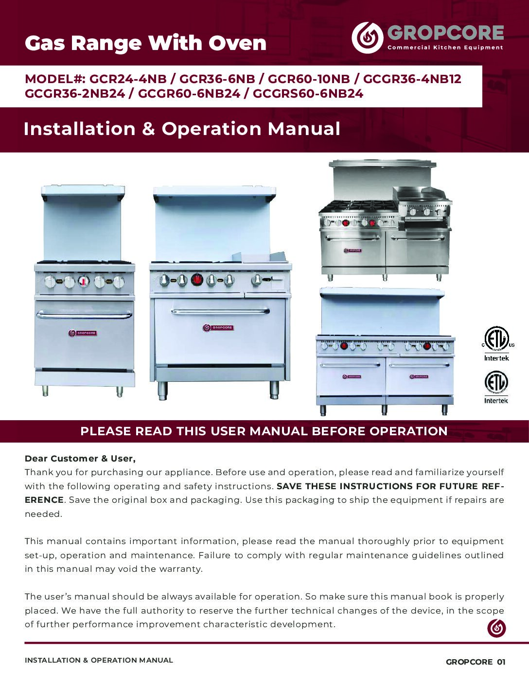 - GCGR36-2NB24: 915 × 827 × 1532 mm | 2 burners + griddle (30,000 BTU) + oven