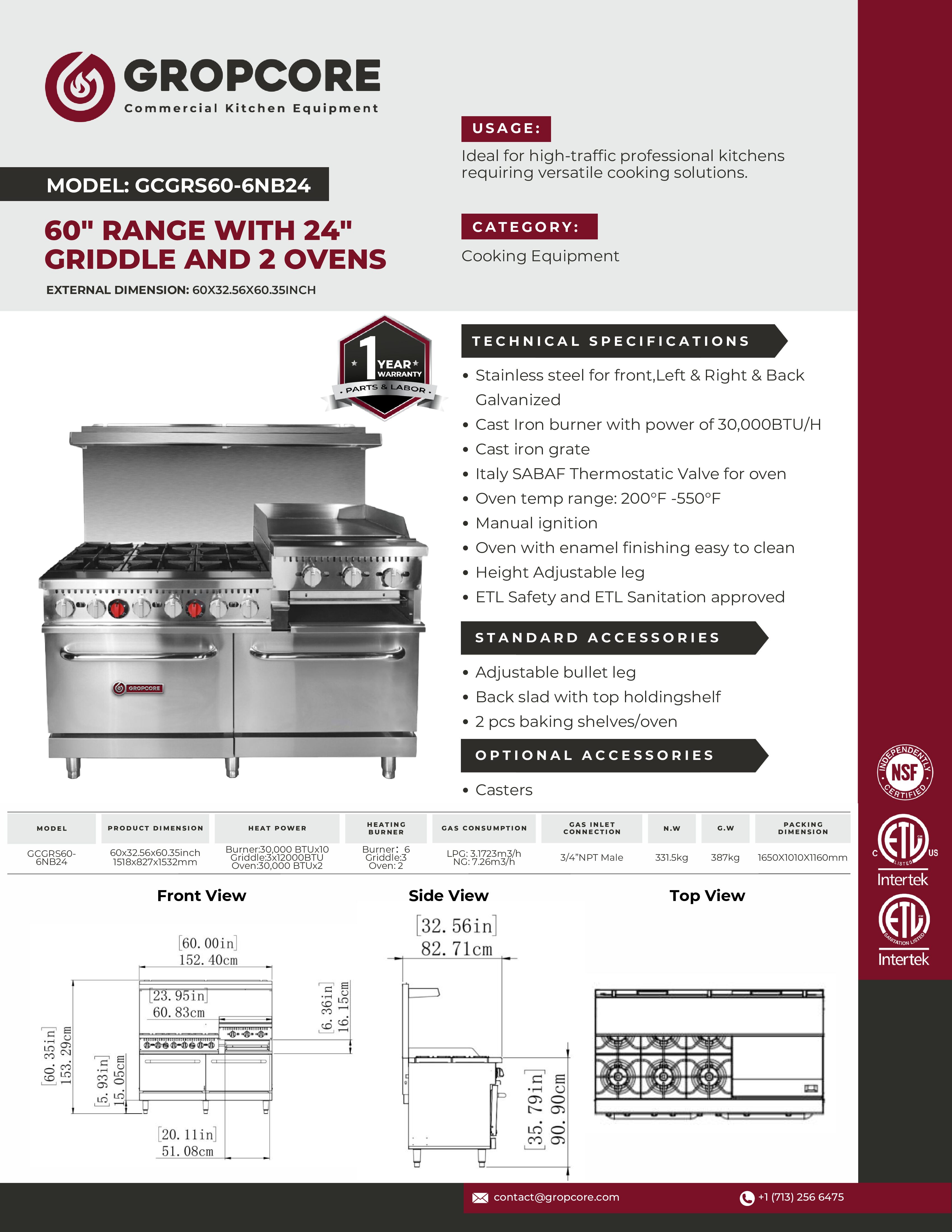 - GCGR60-6NB24: 1524 × 827 × 1532 mm | 6 burners + oven + griddle