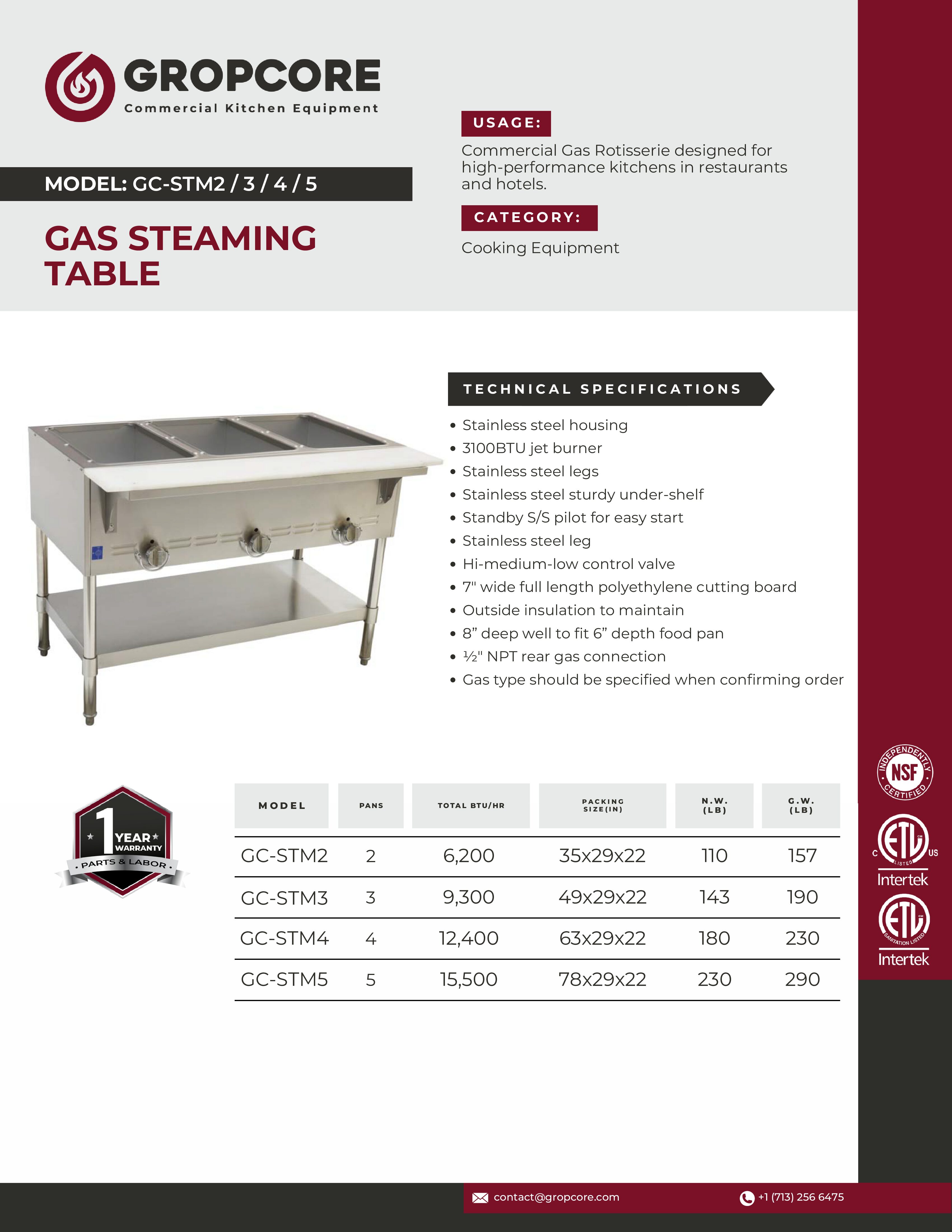 - Usage: Gas steaming table for holding and warming food in commercial kitchens.