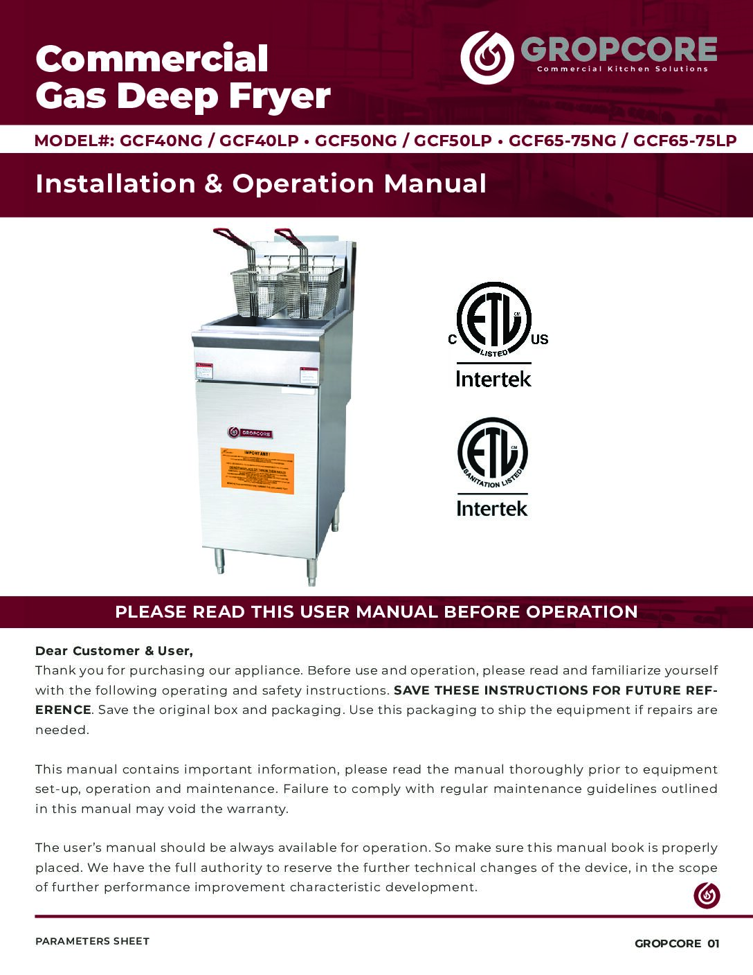 - GCF50NG/LP: 22.4 – 26.2 L | 2.5 lbs per basket | Net Weight: 66 kg