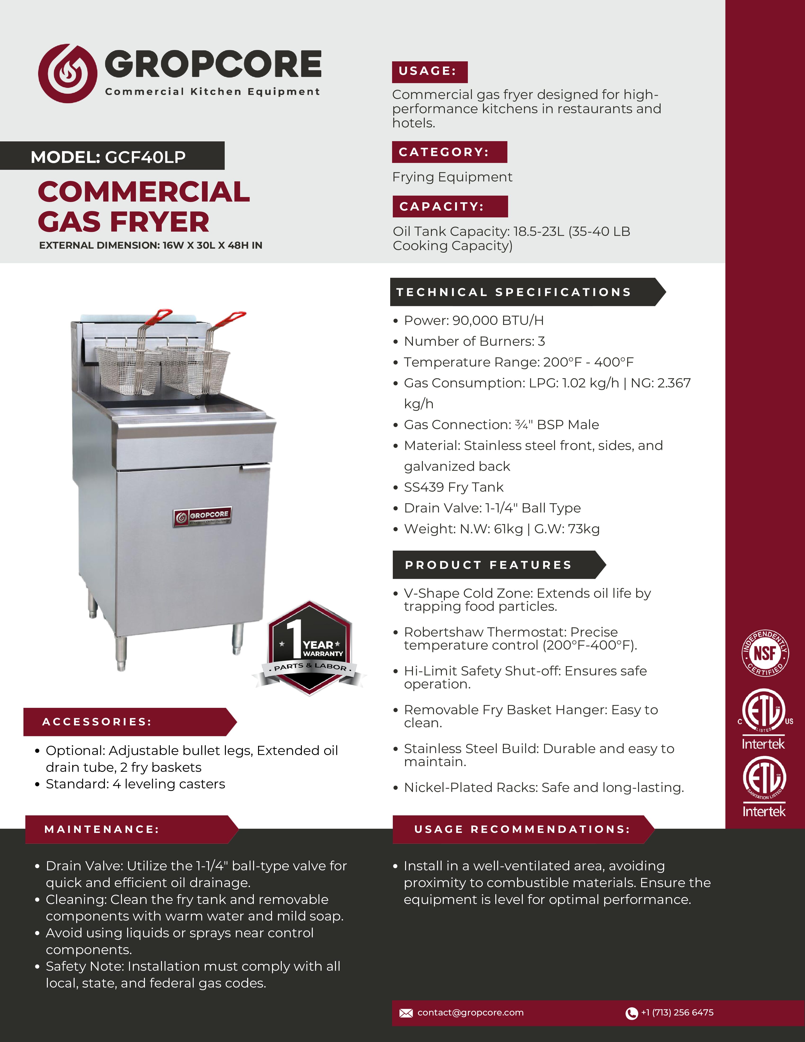 - GCF40NG/LP: 20 – 24 L | 1.5 lbs per basket | Net Weight: 61 kg